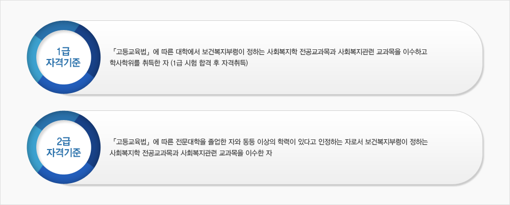 - 「고등교육법」에 따른 대학에서 보건복지부령이 정하는 사회복지학 전공교과목과 사회복지관련 교과목을 이수하고 학사학위를 취득한 자 (1급 시험 합격 후 자격취득)