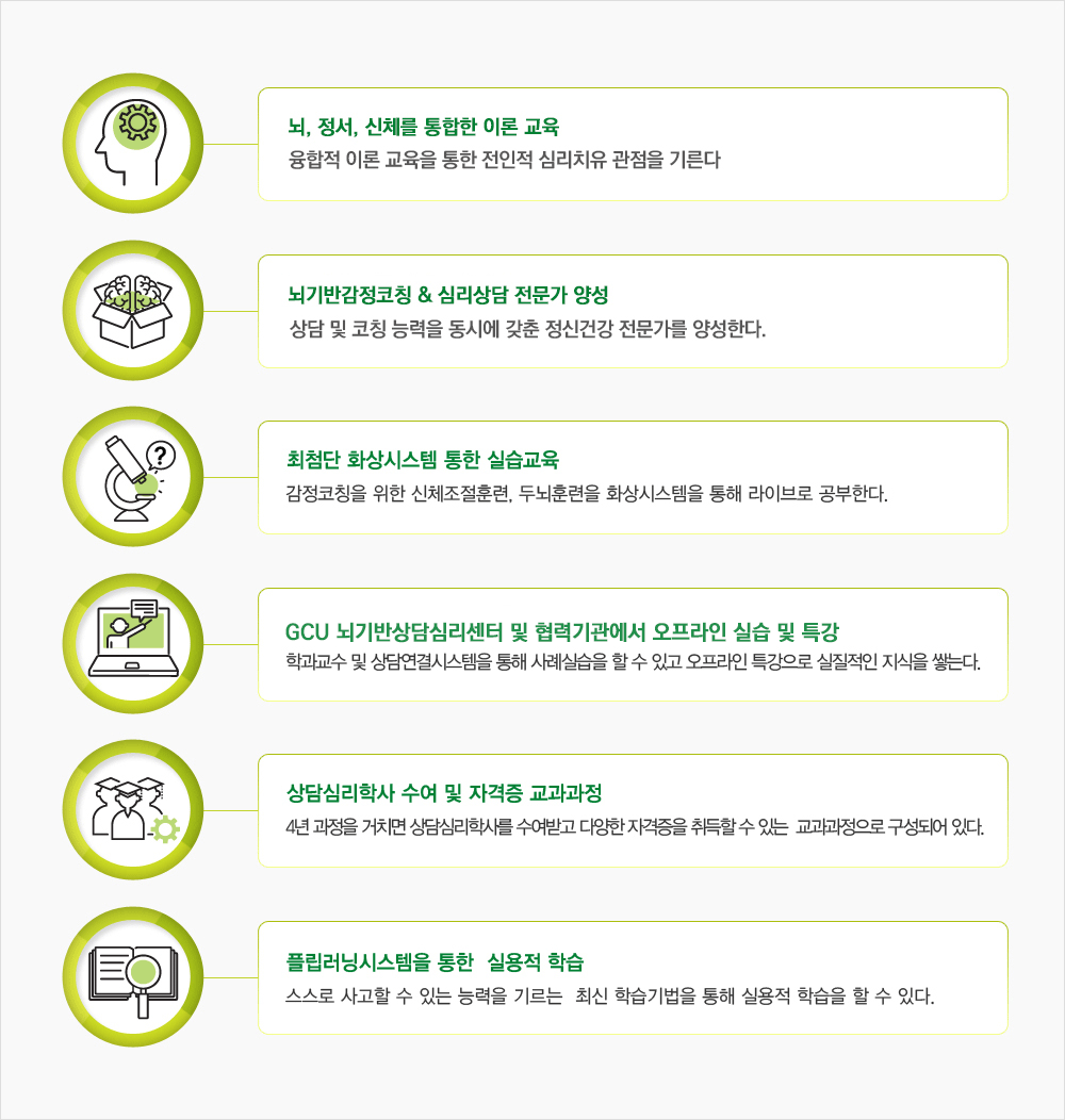 뇌기반상담심리학과는 뇌과학에 기반한 상담 및 코칭에 관한 이론과 실무를 겸비한 교육과정을 구성하고 있습니다. 기초과정, 발달과정, 심화과정을 통해 전문성 함양 및 다양한 국가 자격증과 민간 자격증을 취득할 수 있고, 졸업 후 자격증과 연계하여 전문가로 활동할 수 있으며 다양한 분야의 강사활동을 지원하고 있습니다.