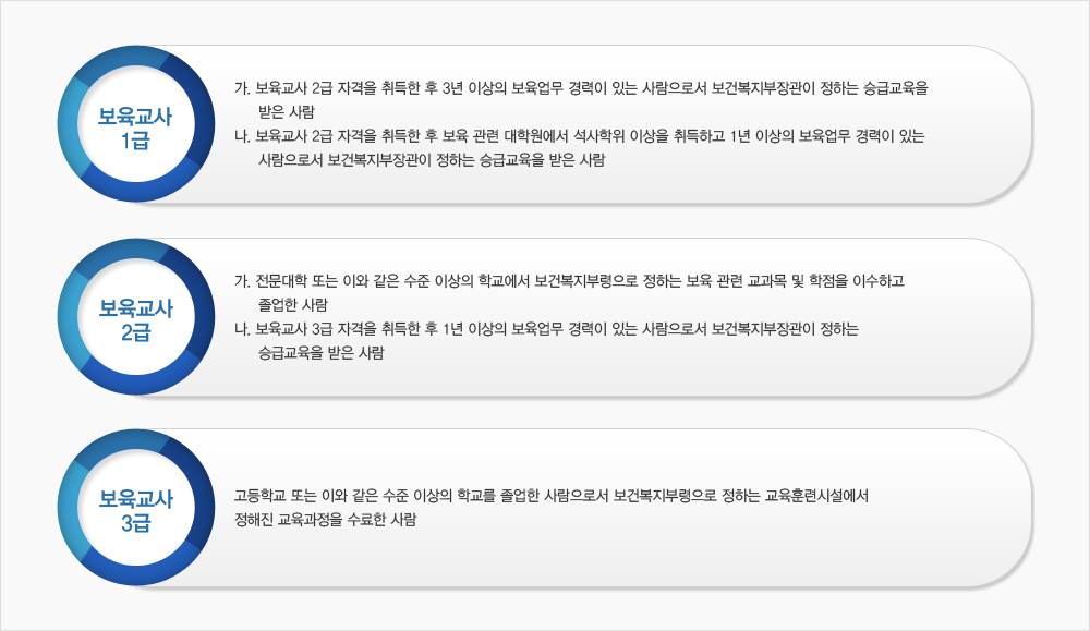 - 가. 보육교사 2급 자격을 취득한 후 3년 이상의 보육업무 경력이 있는 사람으로서 보건복지부장관이 정하는 승급교육을 받은 사람